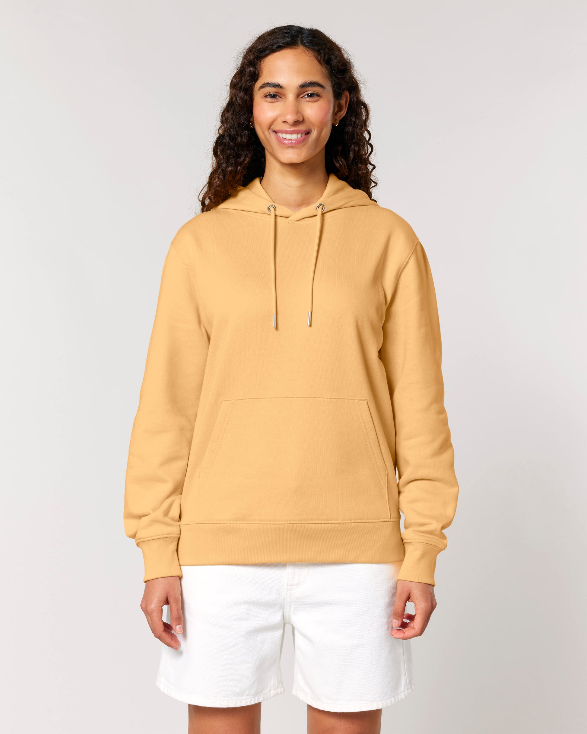De iconische unisex hoodie combineert stijl, comfort en duurzaamheid in één. Met een medium fit en verkrijgbaar in XXS tot 5XL, is dit sweatshirt geschikt voor iedereen. Het 350 GSM gebrushte organisch katoen voelt zacht en luxe aan, maar blijft stevig en vormvast, zelfs na veelvuldig dragen en wassen. De hoodie is afgewerkt met verfijnde details zoals een dubbel gevoerde capuchon, ronde koorden met metalen uiteinden, herringbone tape aan de binnenzijde en een handige kangoeroezak. Dubbele stiksels en stevige ribboorden zorgen voor een hoogwaardige afwerking en lange levensduur.
