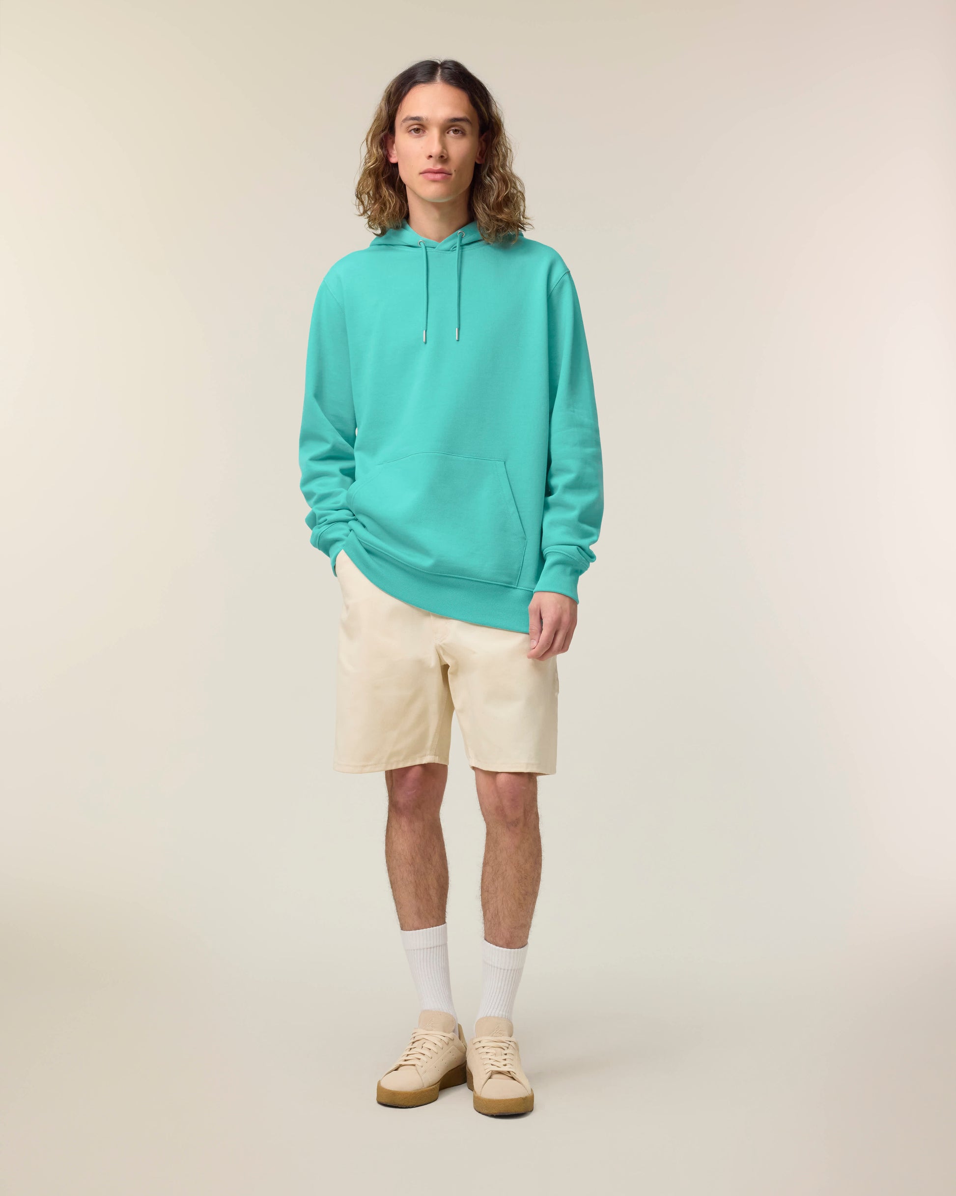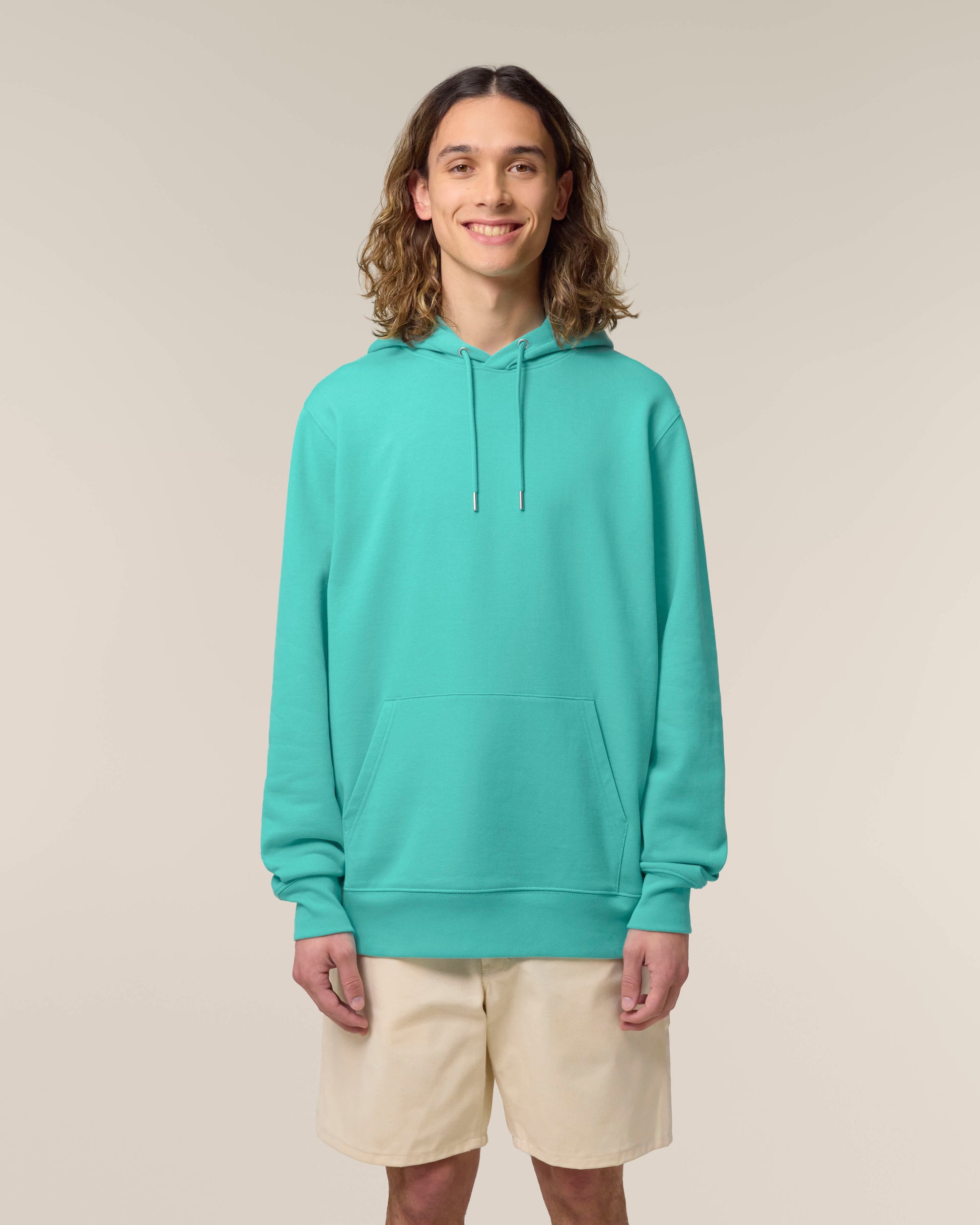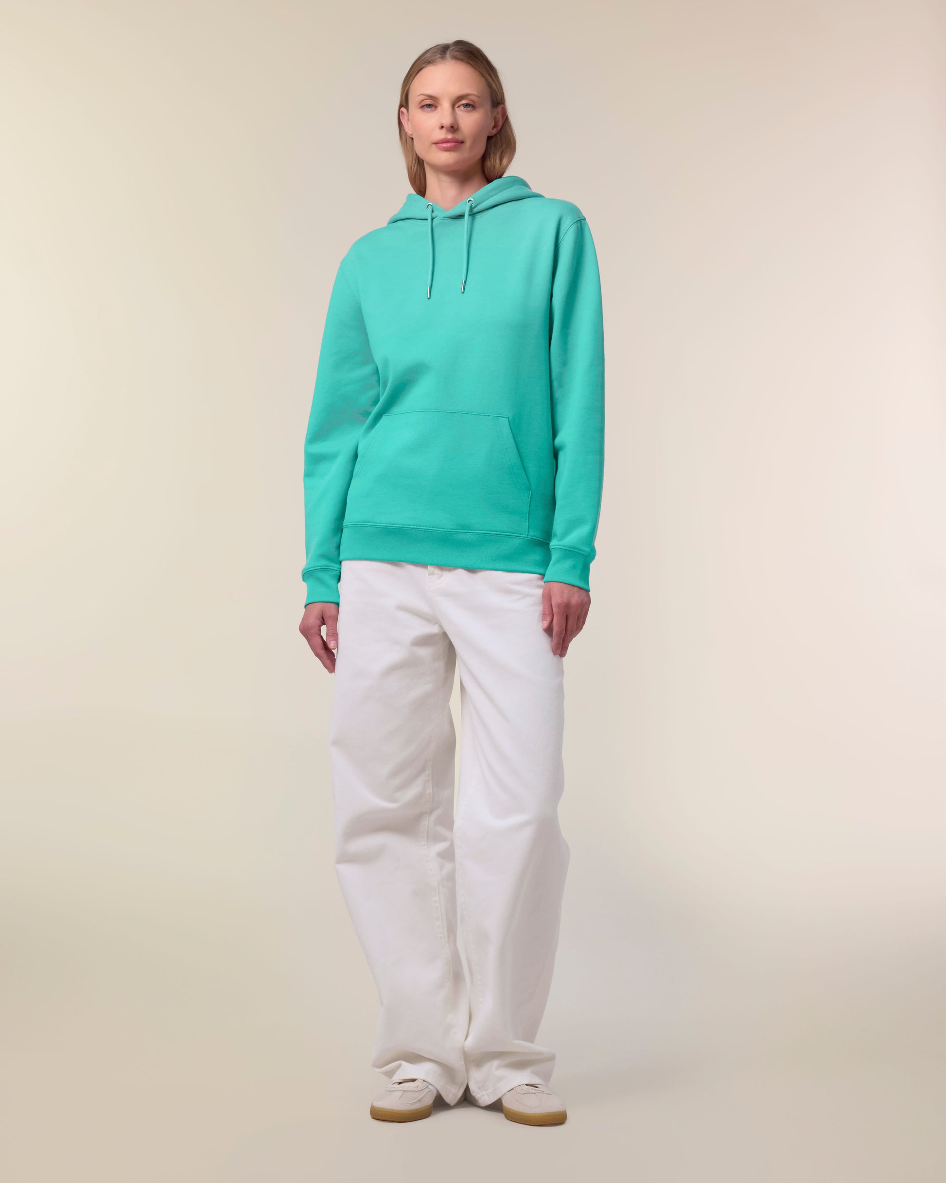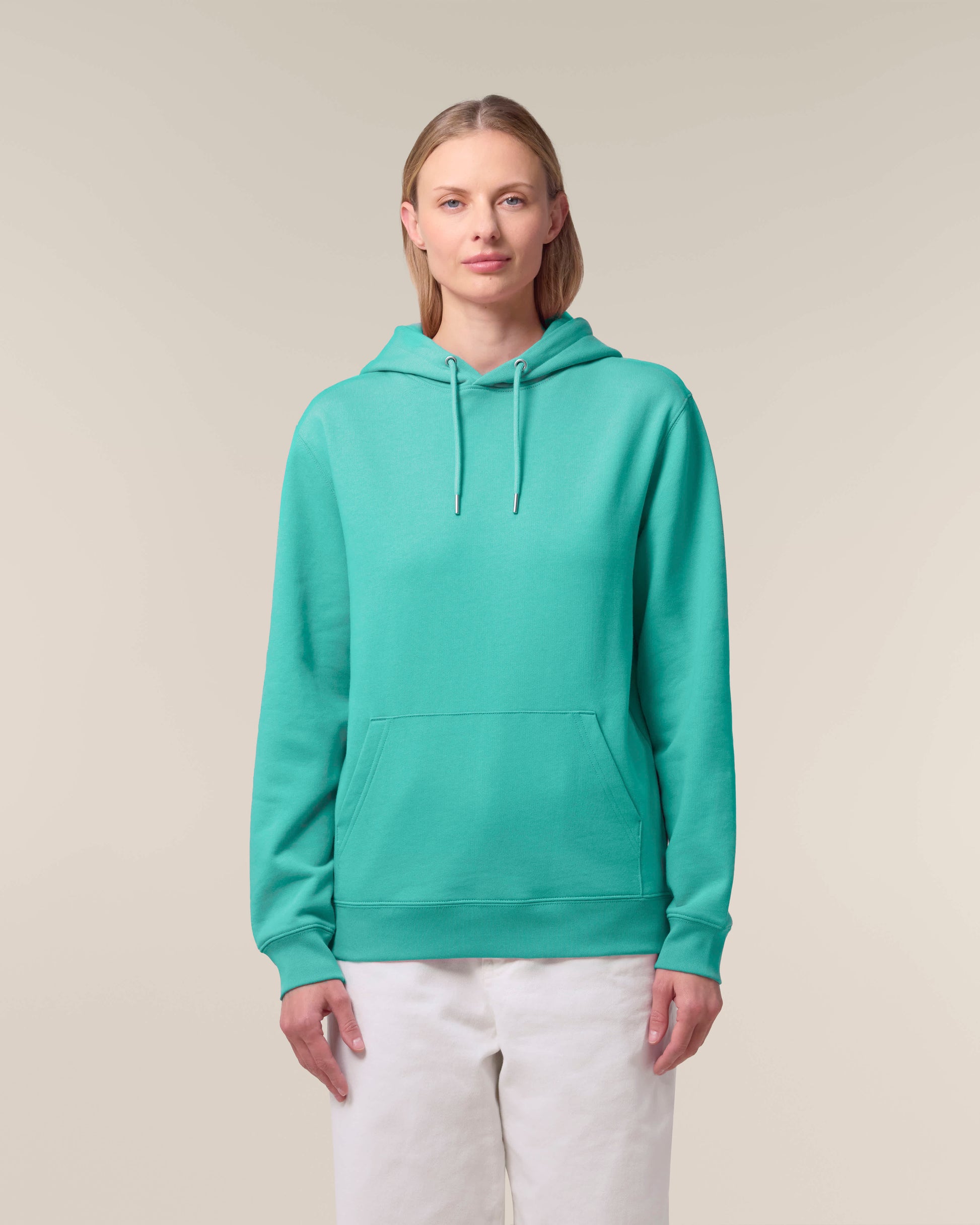 De iconische unisex hoodie combineert stijl, comfort en duurzaamheid in één. Met een medium fit en verkrijgbaar in XXS tot 5XL, is dit sweatshirt geschikt voor iedereen. Het 350 GSM gebrushte organisch katoen voelt zacht en luxe aan, maar blijft stevig en vormvast, zelfs na veelvuldig dragen en wassen. De hoodie is afgewerkt met verfijnde details zoals een dubbel gevoerde capuchon, ronde koorden met metalen uiteinden, herringbone tape aan de binnenzijde en een handige kangoeroezak. Dubbele stiksels en stevige ribboorden zorgen voor een hoogwaardige afwerking en lange levensduur.