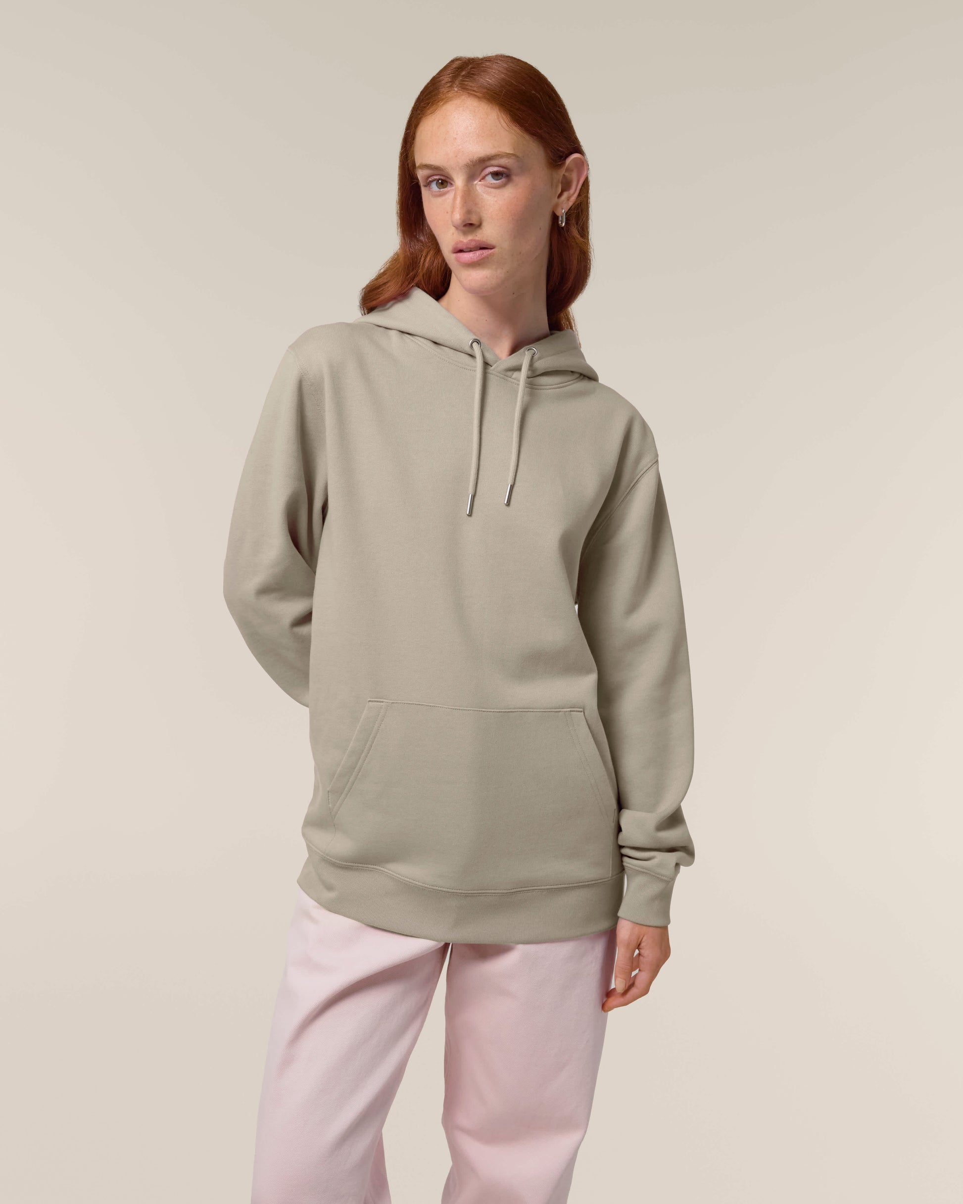De iconische unisex hoodie combineert stijl, comfort en duurzaamheid in één. Met een medium fit en verkrijgbaar in XXS tot 5XL, is dit sweatshirt geschikt voor iedereen. Het 350 GSM gebrushte organisch katoen voelt zacht en luxe aan, maar blijft stevig en vormvast, zelfs na veelvuldig dragen en wassen. De hoodie is afgewerkt met verfijnde details zoals een dubbel gevoerde capuchon, ronde koorden met metalen uiteinden, herringbone tape aan de binnenzijde en een handige kangoeroezak. Dubbele stiksels en stevige ribboorden zorgen voor een hoogwaardige afwerking en lange levensduur.