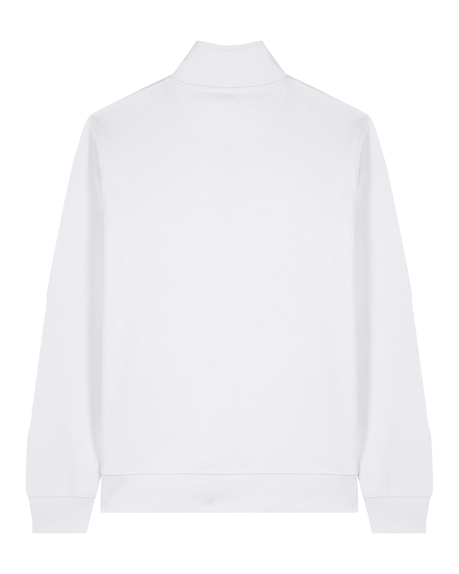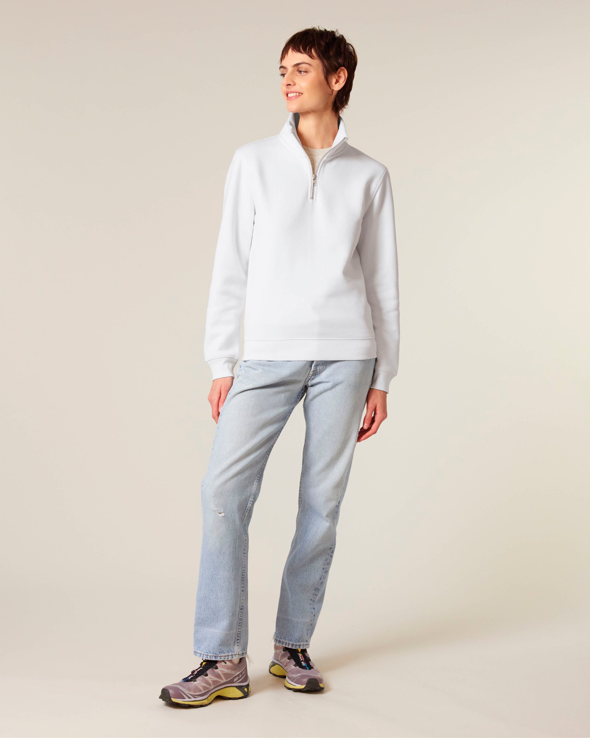 Deze unisex zip sweater is een comfortabele klassieker met een moderne twist. De kwart-rits aan de voorkant geeft een sportieve uitstraling en maakt het vest veelzijdig in gebruik: draag het open voor een casual look of gesloten voor extra warmte. Gemaakt van 100% organisch katoen in stevige French Terry kwaliteit, voelt de sweater duurzaam en authentiek aan. Het design wordt versterkt door de nette afwerking met herringbone tape en dubbele stiksels. Een veelzijdig kledingstuk dat stijl en comfort moeiteloos combineert.