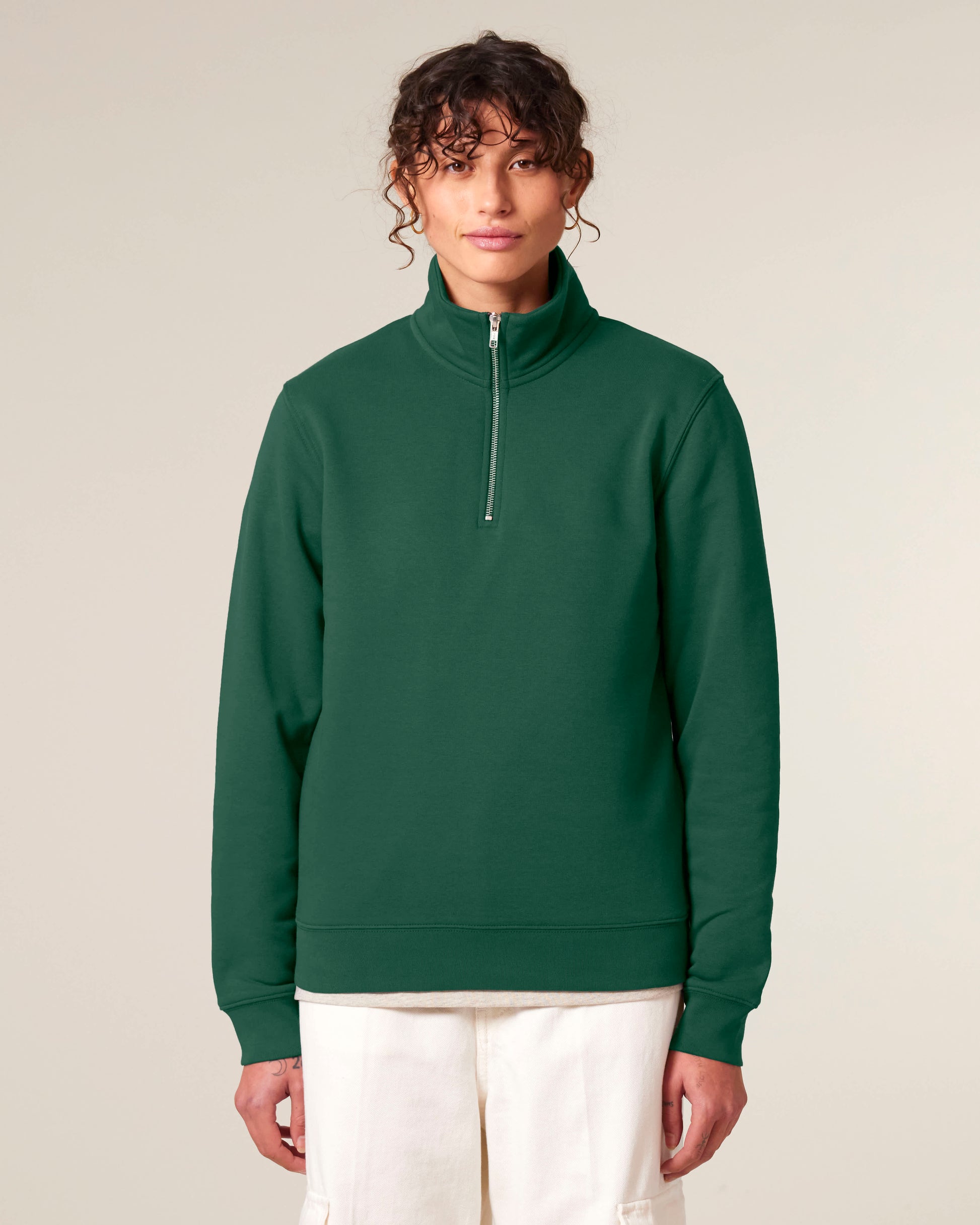 Deze unisex zip sweater is een comfortabele klassieker met een moderne twist. De kwart-rits aan de voorkant geeft een sportieve uitstraling en maakt het vest veelzijdig in gebruik: draag het open voor een casual look of gesloten voor extra warmte. Gemaakt van 100% organisch katoen in stevige French Terry kwaliteit, voelt de sweater duurzaam en authentiek aan. Het design wordt versterkt door de nette afwerking met herringbone tape en dubbele stiksels. Een veelzijdig kledingstuk dat stijl en comfort moeiteloos combineert.
