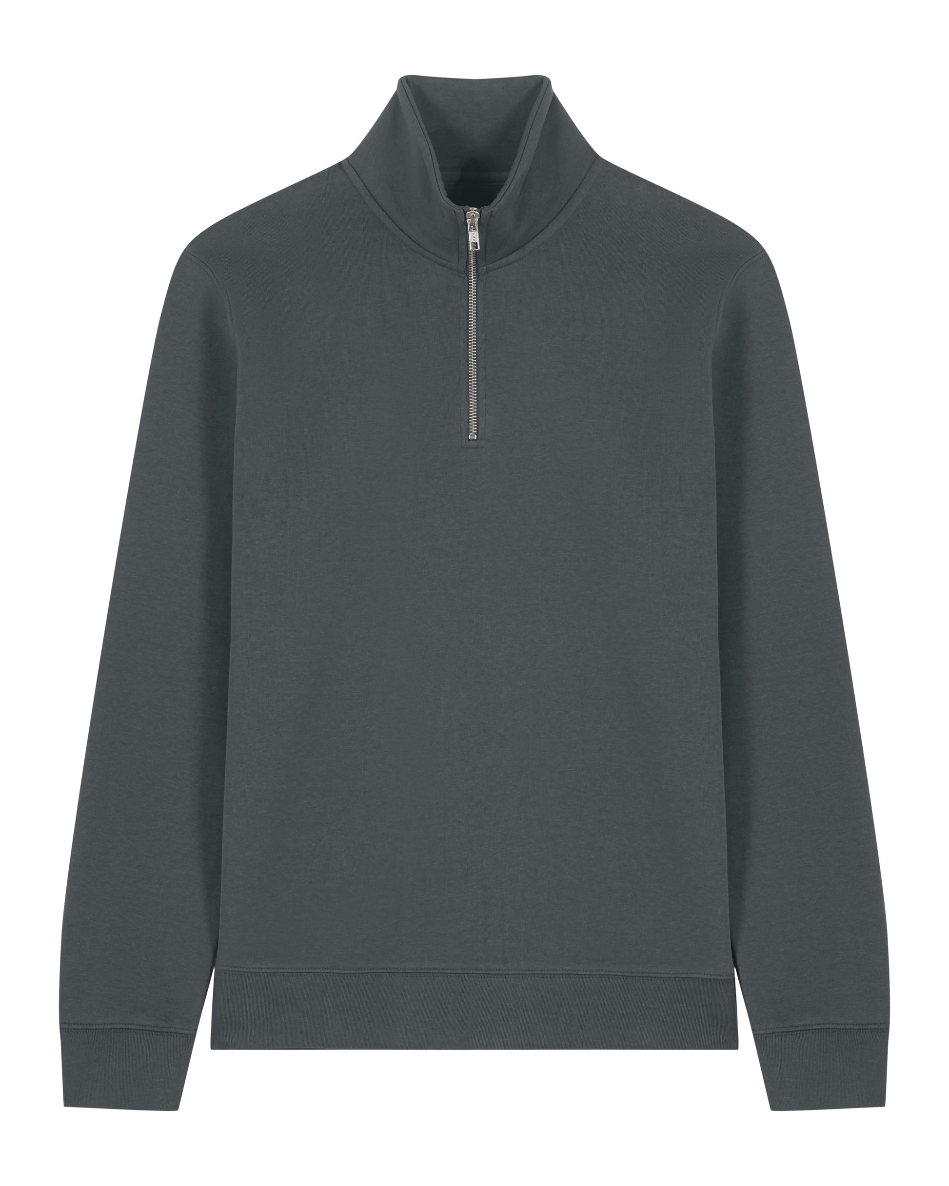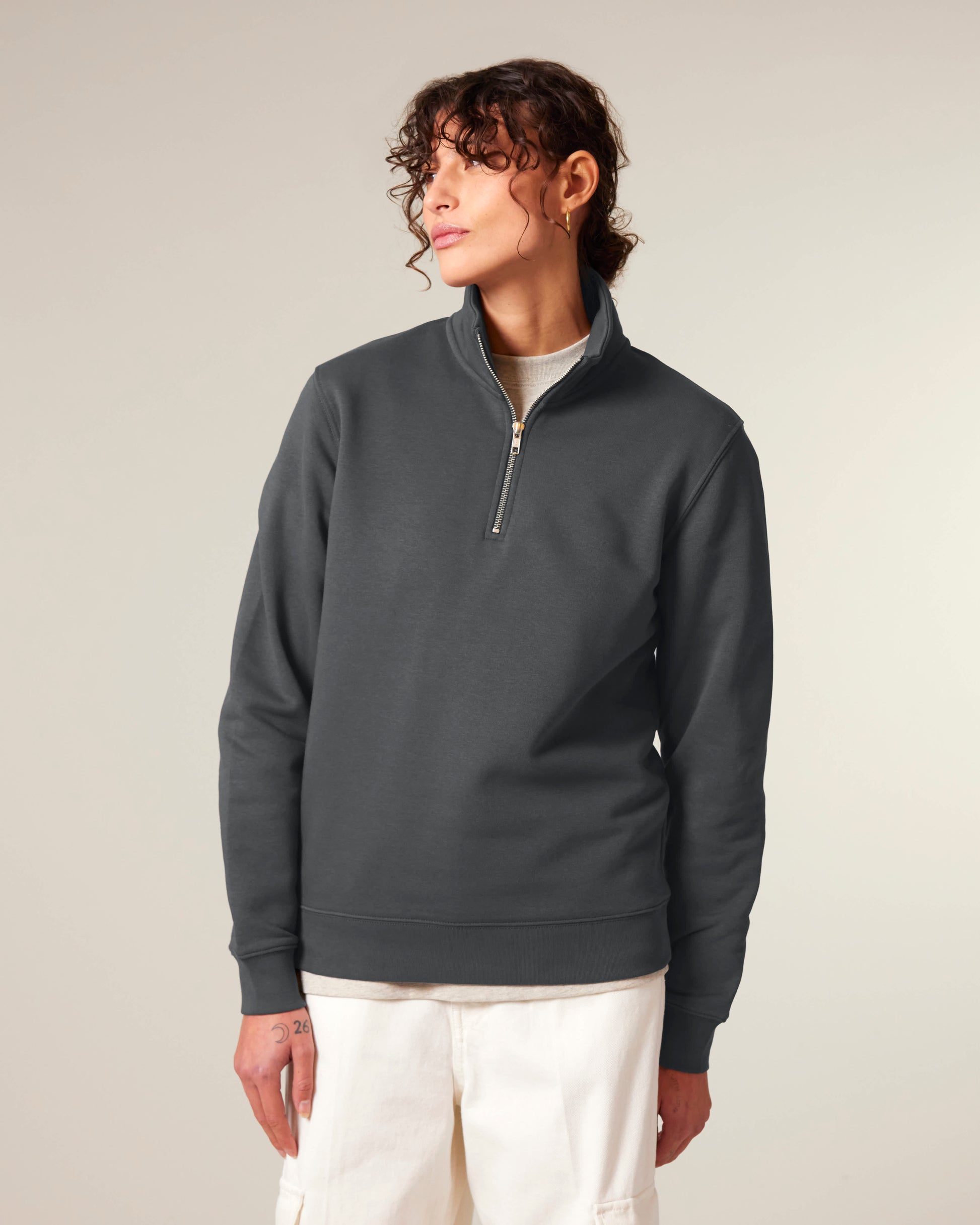 Deze unisex zip sweater is een comfortabele klassieker met een moderne twist. De kwart-rits aan de voorkant geeft een sportieve uitstraling en maakt het vest veelzijdig in gebruik: draag het open voor een casual look of gesloten voor extra warmte. Gemaakt van 100% organisch katoen in stevige French Terry kwaliteit, voelt de sweater duurzaam en authentiek aan. Het design wordt versterkt door de nette afwerking met herringbone tape en dubbele stiksels. Een veelzijdig kledingstuk dat stijl en comfort moeiteloos combineert.